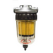 Complete fuel filter and water separating assembly, includes a composite or alloy housing with a replaceable 10 micron filter element, completely see-through clear bowl which is drained via a screw in drain plug. Also incorporates a rubber indicating ring which floats when water is present. Alloy tails to suit 10mm hose and 3/8" NPT plugs to suit multiple mounting requirements.